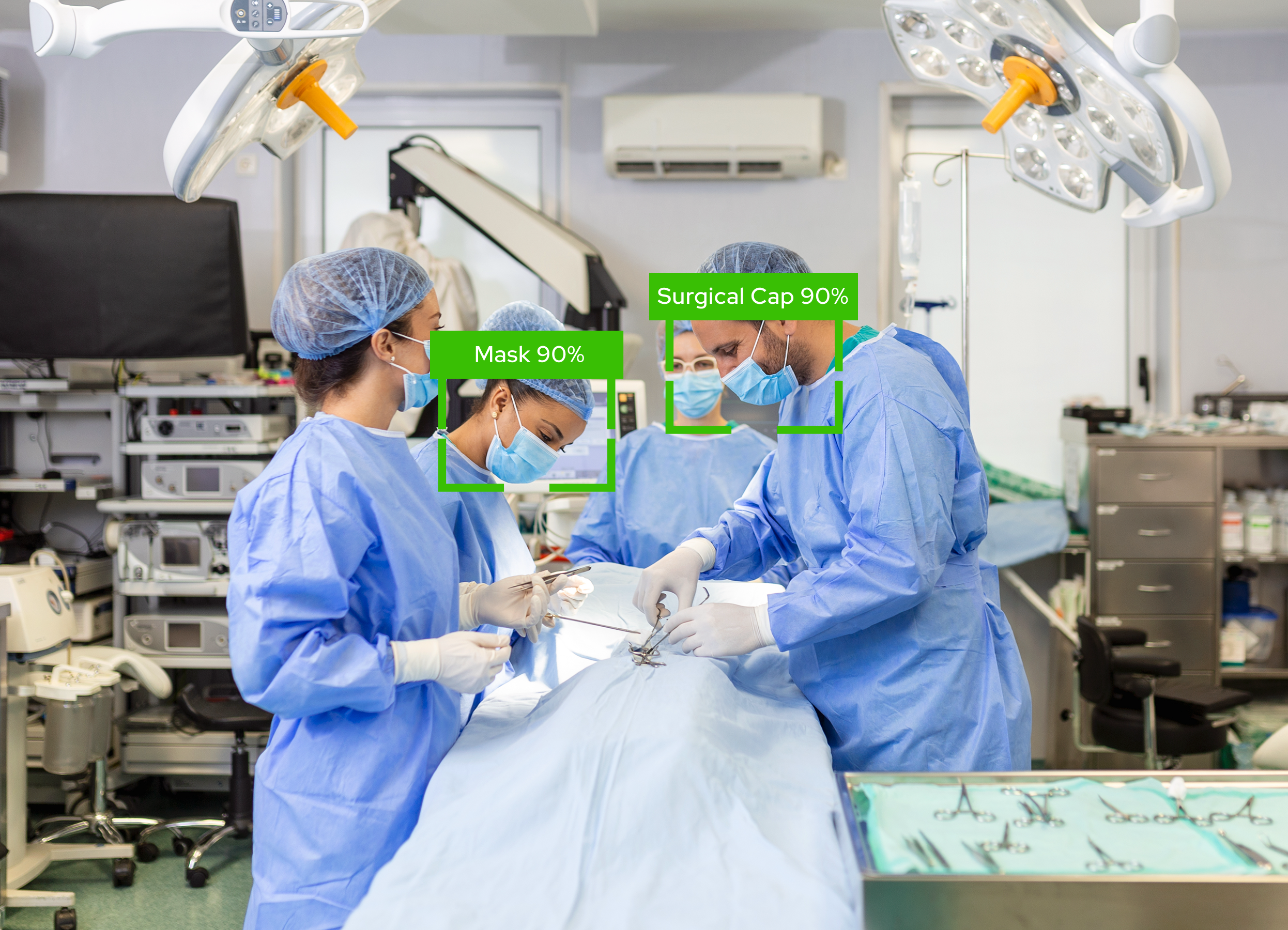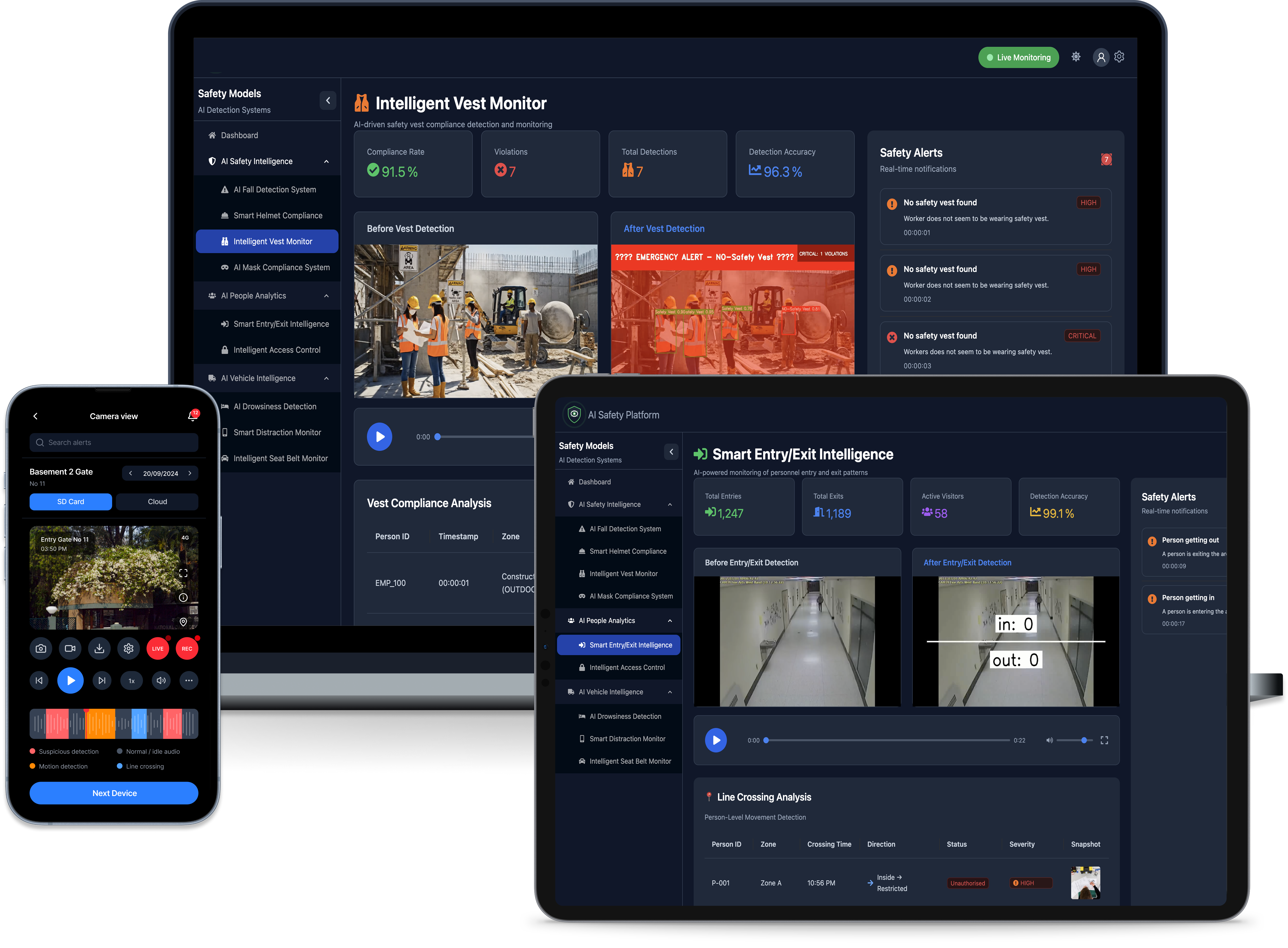AI processes video in real time to identify faces, detect safety compliance, and spot security threats.